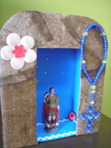 O terço foi feito com miçangas e colado ao oratório, assim como a flor de tecido.