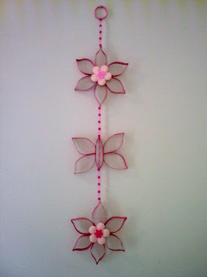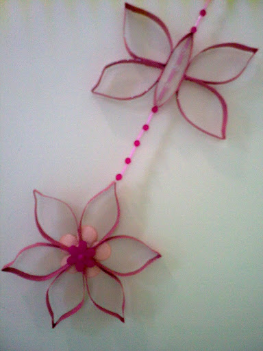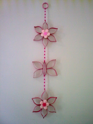 Móbile misto com duas flores e uma borboleta todo em tons de rosa.