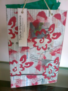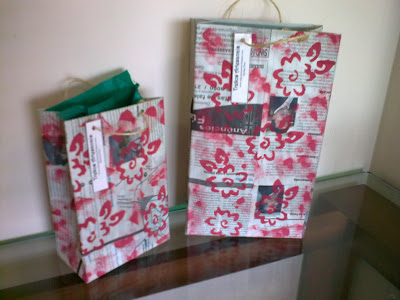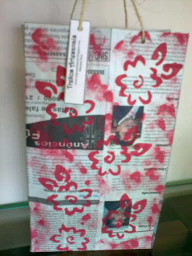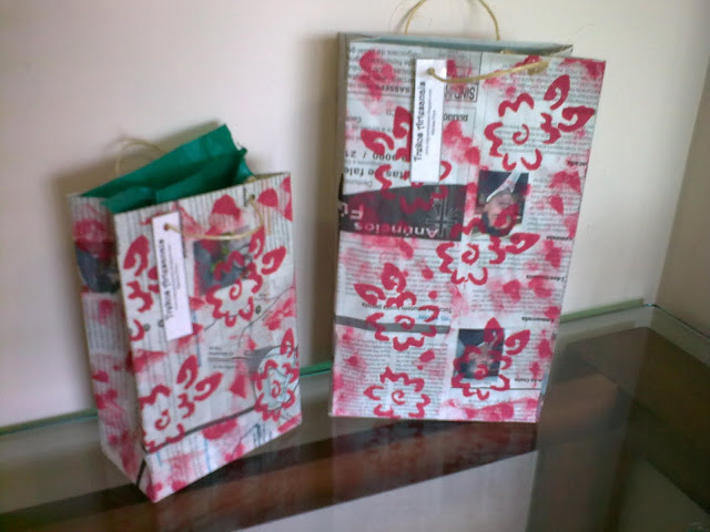 Embalagens para presente feitas com sacolinhas de jornal pintadas com tinta para artesanato.