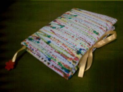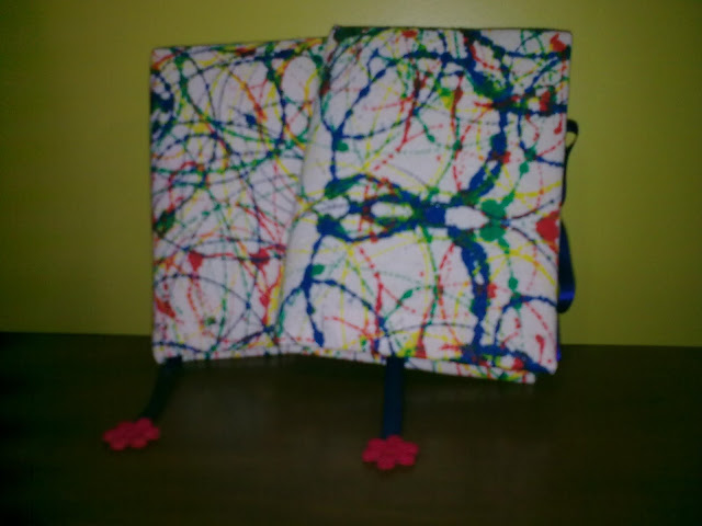 Detalhe das amarrações laterais e marcador de página com fita de cetim e florzinhas de tecido.